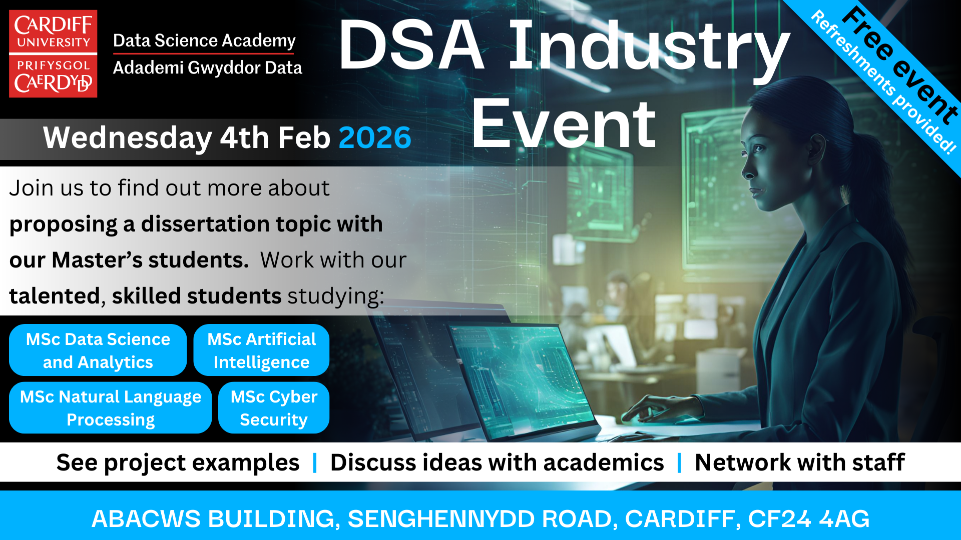 Cardiff University’s Data Science Academy (DSA) is hosting an in-person session for companies and external organisations to learn more about suggesting a dissertation topic for our students to work on.