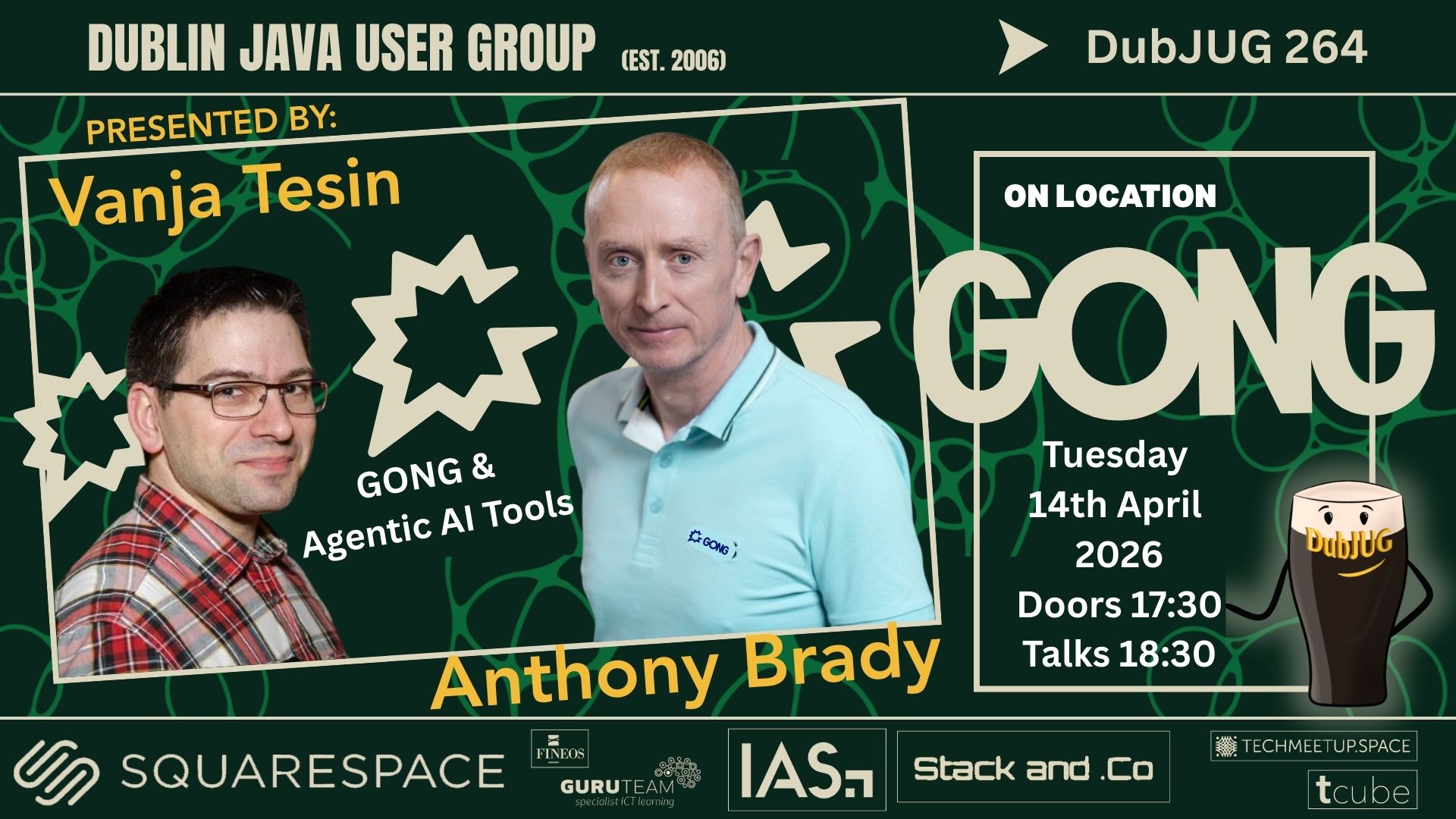 DubJUG 264, our live in-person event is taking place in our partner Gong’s HQ on the evening of April 16th. Doors 17:30.