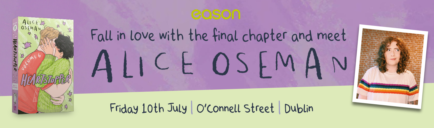 Tickets Info: €14.99 and includes a copy of Heartstopper Volume 6 and the opportunity to meet Alice and have up to 2 books signed. Attendees can choose which books Alice signs, it can be their new copy of Heartstopper Volume 6 (which you will receive at the venue on the day) or a beloved copies from elsewhere in the Osemanverse.