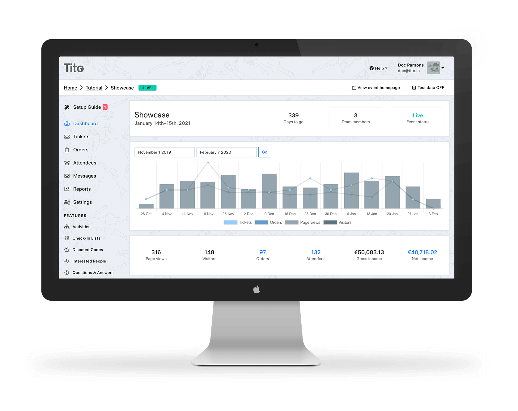 Easily see how many tickets you’ve sold, and run reports to find out how your event is performing. Connect to Google Analytics and add tracking for your paid campaigns. All your data is exportable too. Read more.