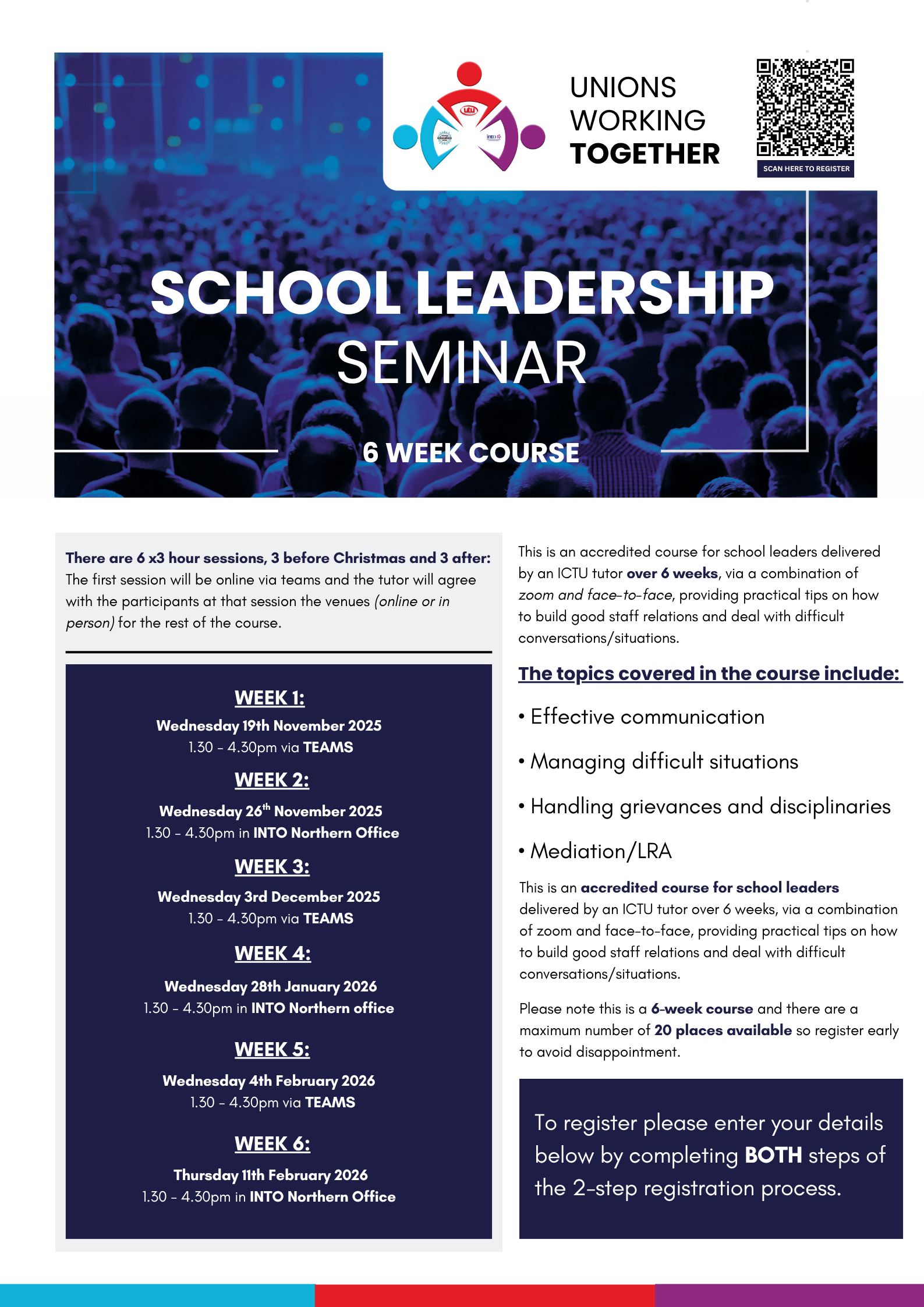 This is an accredited course for school leaders delivered by an ICTU tutor over 6 weeks, via a combination online (via Microsoft Teams) and face-to-face, providing practical tips on how to build good staff relations and deal with difficult conversations/situations.